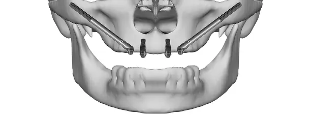 Alegem acest tratament atunci când osul maxilar este foarte redus. Implanturile zigomatice sunt ancorate în osul zigomatic și oferă sprijin pentru proteze imediate, fără să fie necesară adiția osoasă.